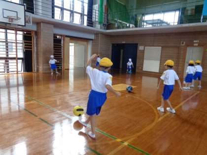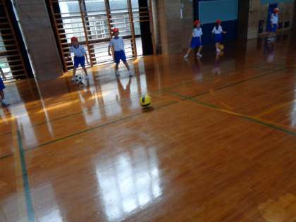 今日から「ボールけりゲーム」というボールを蹴る運動を始めました。今日は初めてのボール蹴りなので、足の内側で蹴ったり止めたりする練習をしました。ボールが思うように真っ直ぐ行かなかったり、止めようとした足をボールがすり抜けてしまう場面もありましたが、それも含めて楽しそうに声を上げながら運動していました。