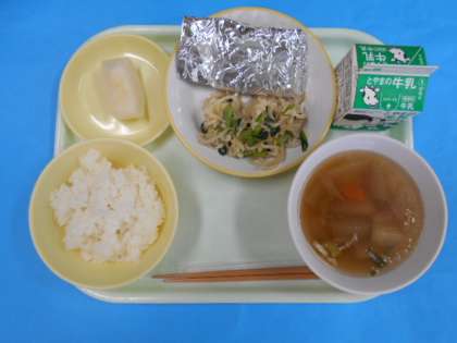 今日のメニューは、ごはん、ぎゅうにゅう、とうがんスープ、はりはりあえ、さばのぎんがみやきです。さばのぎんがみやきは、あまみそがさばにしみて、とてもおいしかったです。こどもたちのにんきメニューの1つです。