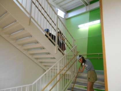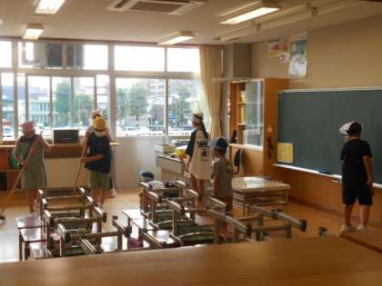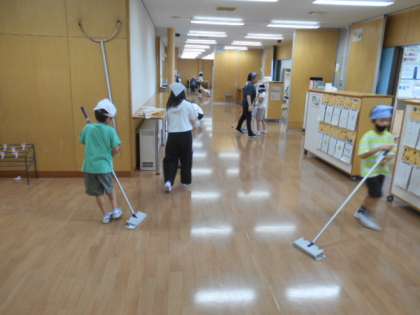 清掃の時間、たてわり班で取り組んでいます。すみずみまできれいにしようと、力を合わせてがんばっている西っ子です。