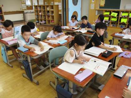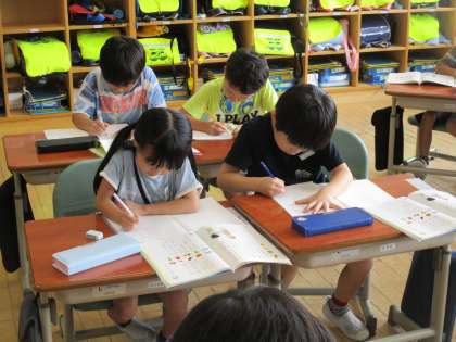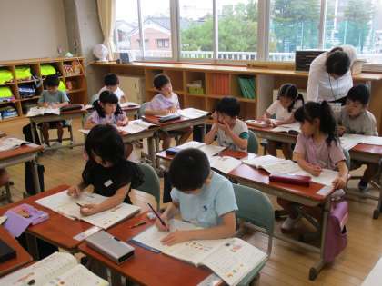 国語科「ことばをみつけよう」では、ますの中に書かれている複数の文字の中から、言葉を見付けるという学習をしました。どんな言葉が隠れているか真剣に探していました。