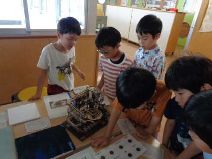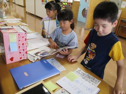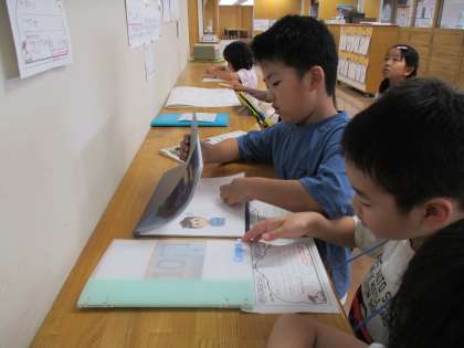 全校の夏休み作品展を鑑賞しました。作品を見ながら、「10円玉がコーラできれいになると知ってびっくりした」「ぼくも来年やってみたいな」など様々な感想が聞こえてきました。お兄さん、お姉さんたちの作品を見て、たくさんの刺激をもらったようです。