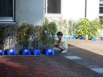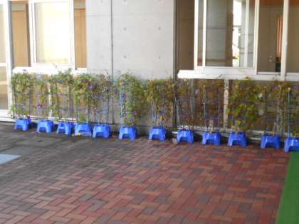 夏休み中、家で育てていたアサガオが大きくなりました。種ができているものもあれば、まだ花が咲いているものもあります。水やりを継続して行っています。