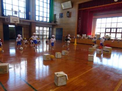 的の箱に当てる力も上達し、それぞれの色団の得点も日増しに高くなってきました。今日は、さらにゲーム性を高め、2チーム対抗で1分間蹴り続けて得点を競いました。どの箱をねらうか考えながらボールを蹴る子や、やみくもに蹴る子など、どの子も夢中になってゲームに取り組みました。