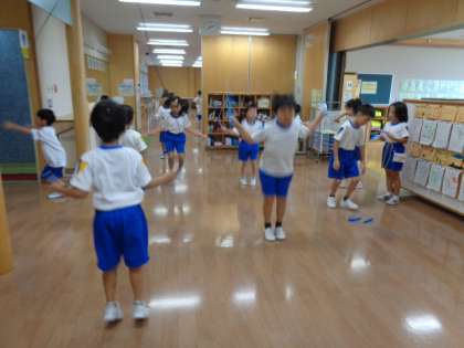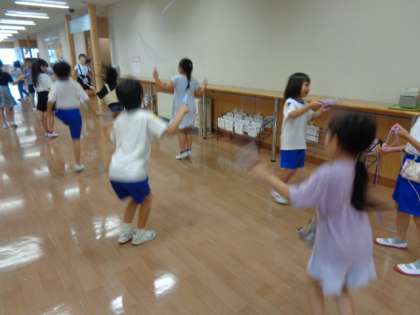 隔日で、朝の縄跳びタイムがあります。子供たちも学校生活に慣れ、音楽が始まると自然と縄跳びを準備して、各々に跳び始めています。夏休み中に練習して、跳ぶ回数や跳べる技を増やした子供もいて、記録を更新する度に嬉しそうに報告してくれます。