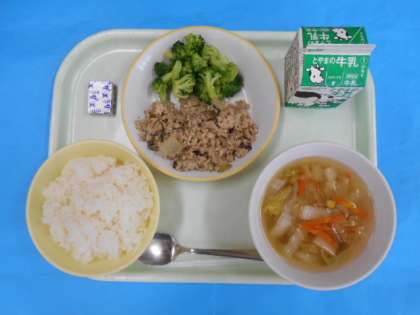 今日のメニューは、ごはん、ぎゅうにゅう、コーンスープ、とやまのえごまいりガパオライス、ポケットチーズです。ガパオライスは、タイのこくみんてきなりょうりだそうです。とやまのえごまがはいり、さらにおいしくいただきました。