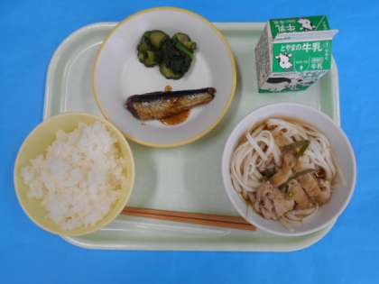 今日のメニューは、ごはん、ぎゅうにゅう、きつねうどん、とろろこんぶあえ、いわしのとさにです。とろろこんぶあえは、つるっとしたとろろこんぶのうまみを味わいながらいただきました。