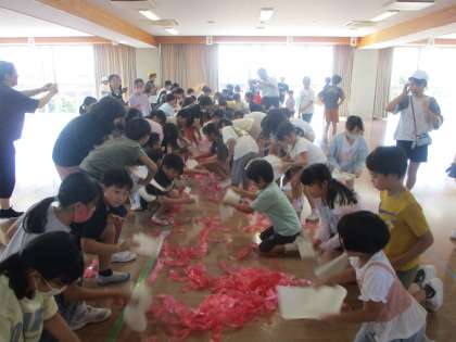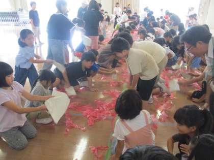 「ハッピースマイル 集会委員会」が企画している「スマレク」。スマイルが広がるレクリエーションの第三回目です。今回の種目はテープ飛ばしゲームです。二つのチームに分かれて、もっている紙でテープを飛ばして、相手の陣地にたくさんいれた方が勝ちです。必死にテープを飛ばしながら、スマイルが広がりました。