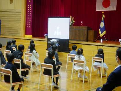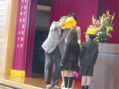 入学式では、新1年生の代表の子供が、交通安全協会西田地方支部長の舟瀬様から安全帽子をかぶせていただきまた。また、6年生の代表の子供たちが、ビデオで入学をお祝いするメッセージを伝えました。1年生の子供たちは、明日から学校に行くのが楽しみになったことと思います。
