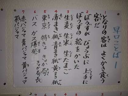 いろいろなことばにふれて、つかってみることは、ことばの ちからを たかめるために とてもたいせつなことです。こんかいは、「あいのきょうしつ」まえに はってある はやくち ことばを しょうかいします。みんなも おうちの ひとと いっしょにちょうせんして みてください