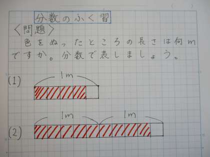 (1)の場合、1mを5等分にしているので、分母は「5」。その内、4マス分までぬられているので、分子は「4」。5等分したものが4つ分なので、答えは「4/5m」。