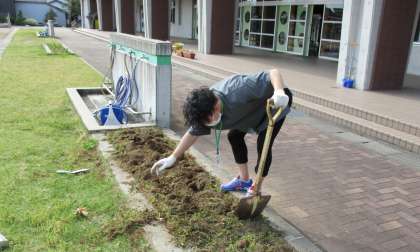 児童玄関前の花壇を耕しました。今年は何が植えられるのでしょうか。芽が出るのが楽しみですね。
