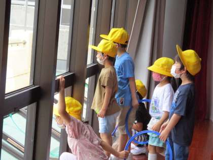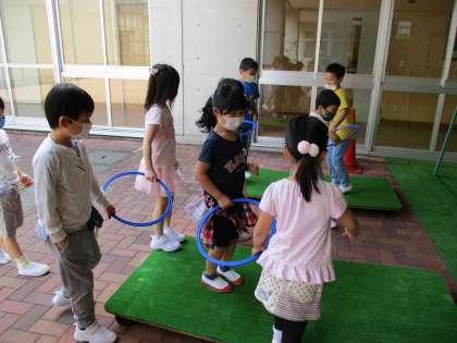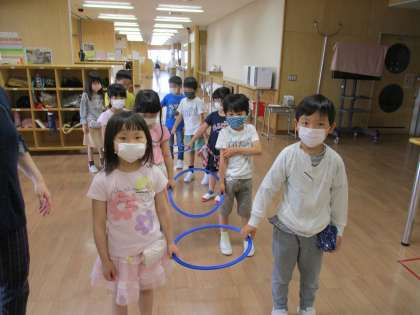 密にならないように、間に輪を持って探検しました。「どんな部屋があるのかな?」「こっちにも行きたいな。」と興味津々で、見て回りました。