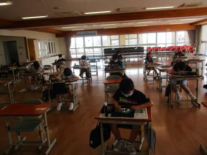 書写の時間に、5年生で「頑張りたい」「成長したい」と思っている一文字を筆で書きました。「思」や「挑」、「明」等、心を込めて丁寧に書いていました。