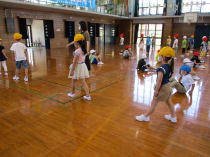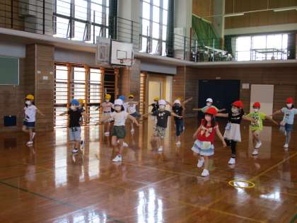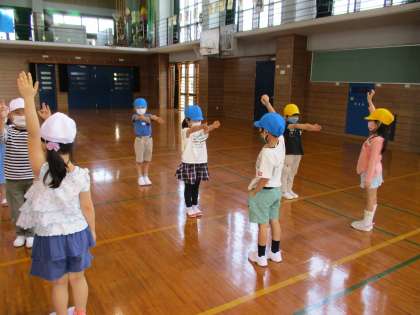 ストレッチをした後、間を開けて並ぶ練習をしたり、回れ右の練習をしたりしました。また、簡単な運動として、片足で10秒間立ったり、3m弱の距離を片足けんけんで進んだりしました。体を動かして、楽しそうな様子でした。