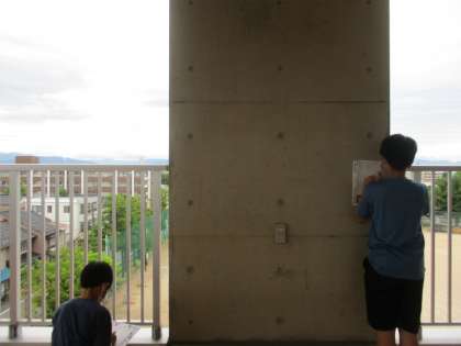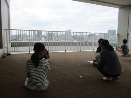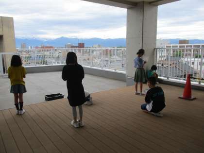 子供たちは、「すごくゆっくりだけど、雲が動いている」、「下の方に黒っぽい雲があるからこの後雨が降るかもしれない」など、気付いたことをメモしながら興味深そうに観察していました。