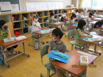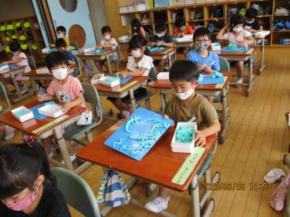 粘土をひも状にして、長い粘土や短い粘土を組み合わせて作品を作りました。ひもひも温泉やかたつむり、ひもひも王国、竜巻など、面白い作品を考えていました。