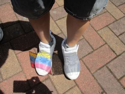 図画工作科の時間に「光のプレゼント」の学習をしました。光を通す材料を集め、カラーペンで着色しました。中庭に出て、白いボードや手のひら、内履き等に映して楽しみました。