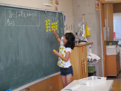 算数の学習では、「わり算」の勉強をしています。一人分がいくつになるのか、また、何人に分けられるのかをおはじきを使って考えました。友達と一緒に考えながら、勉強に励んでいる子供たちです。