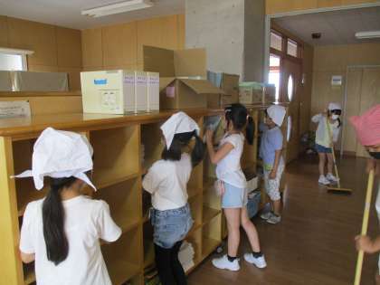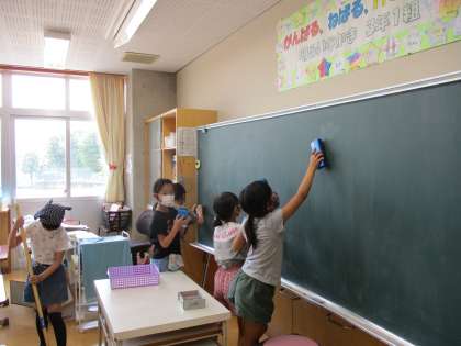 清掃時間は縦割りグループで活動はしていなく、クラスで担当を決めて掃除をしています。3年生は、教室や廊下などを中心に掃除に励んでいます。いつも以上に気になるところをきれいにしようとがんばっている子供たちです。