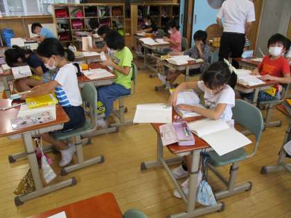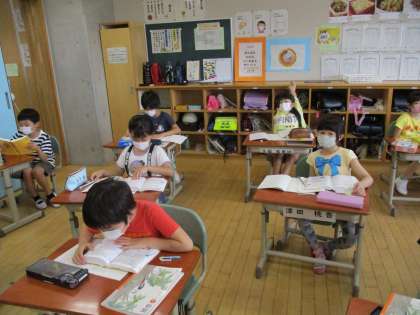 国語で学習した国語辞典の使い方を生かしながら、意味調べをしています。「『「ひだまり』ってどんな意味なの。」「『ふと』って、そんな意味だったんだ」などといいながら、わからない言葉があると、進んで辞書を引いています。休み時間や読書タイムにも辞書を眺めている子供たちです。