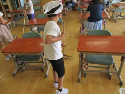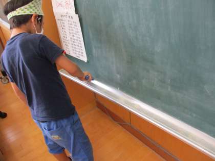 ほうきを上手に使って、隅々まできれいにしています。黒板もピカピカで、気持ちよく学習を進めることができます。