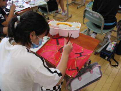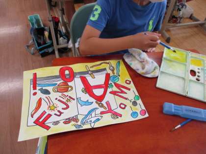 図工「名前でアート」の作成に取り組んでいます。イメージを膨らませて楽しそうに描いています。