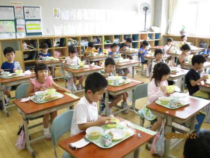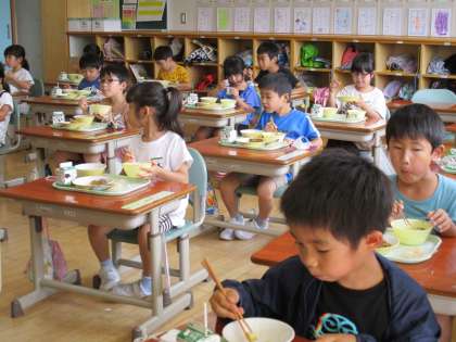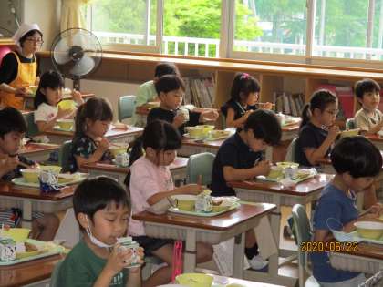 今日から「品数を減らした給食」が始まりました。久しぶりの温かい食事で、子供たちも、黙々と味わって食べていました。