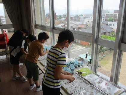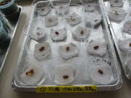 理科の学習では、どのような条件で発芽するかをみんなで予想し、実験に取り組んでいます。
