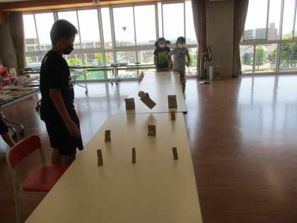 室内での休み時間。段ボールで作った的に、新聞紙のボールを転がして遊んでいます。