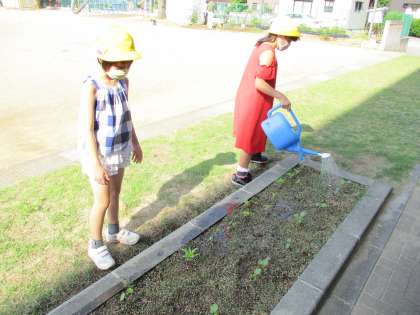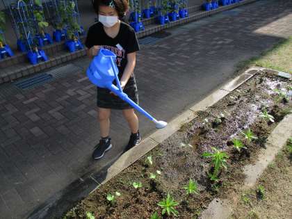 理科の学習で育てている植物に毎朝水やりをしています。どんどん大きく育っている植物を見て「色が変わってきたね」「葉っぱが多くなったよ」と成長を喜んでいます。