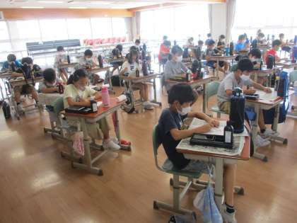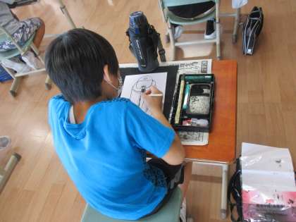 図画工作の時間に、割り箸ペンを使って自分の水筒を描きました。