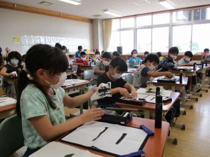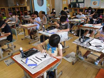 3年生の書写で、書道を学習しています。書道の準備をするのにも、初体験のことが多く、慎重に進めていました。墨汁をすずりに入れるときには、とても緊張している様子でしたが、筆を使い始めると、「楽しい」「トン、スー、トンができたよ」と笑顔かこぼれました。