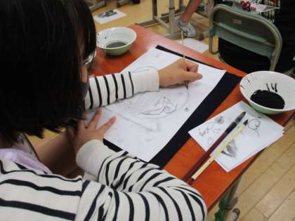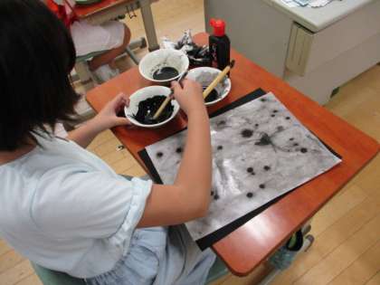 図工「墨で表す」では、水墨画に挑戦しています。水の量を調節したり、筆以外の道具も使ったりしながら表現しました。