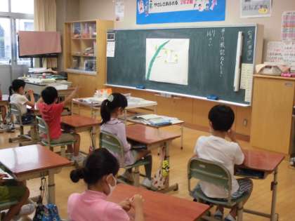 7月6日(月)は、西田地方小学校の147歳の創校記念日です。記念式は放送で行いました。校長先生は、学校の誕生日をお祝いするために、どんなお祝いの仕方があるかを考えるのもいいですねと話されました。子供たちは、熱心に校長先生のお話を聞いていました。また、玄関ホールに、学校の校章の菊の紋章への思いについて掲示されています。