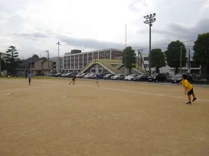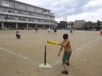 体育の時間にティーボールをしています。思い切り投げたり、打ったりとグラウンド全体を使って、元気いっぱい楽しく取り組んでいます。