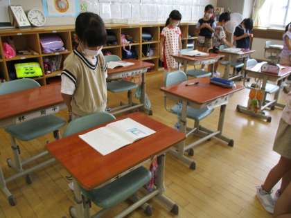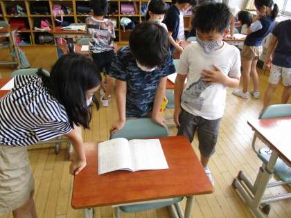 自主学習ノートの見合いタイムです。「イラストがあって分かりやすいね」「色をつけると見やすいよ」などと、友達の工夫に目を向けている子供たちです。