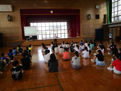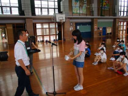 23日に西田地方小学校で「少年消防クラブバッジ授与式」を行いました。各々が火災に対する知識を身につけ、火災予防に努めることを誓いました。