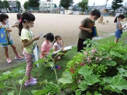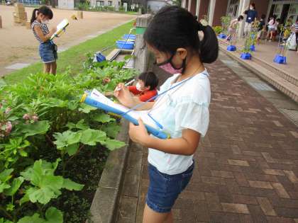 理科で育てている植物が花を咲かせました。「ホウセンカの花は赤とピンク色だね」「大きくなって、茎も太いよ」と、たくさんの発見をしていました。