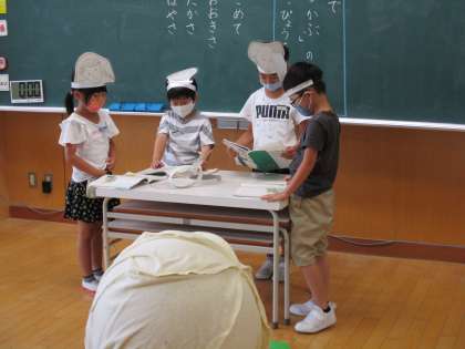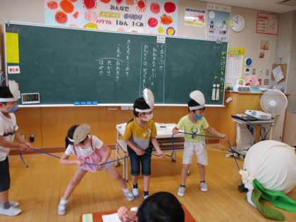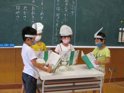 国語科の学習で、「おおきなかぶ」の音読発表をしました。力を入れてかぶをひっぱる役割演技をしながらも、ソーシャルディスタンスを忘れない子供たちでした。それぞれに、グループで決めた自分の担当部分を一生懸命に読んでいました。