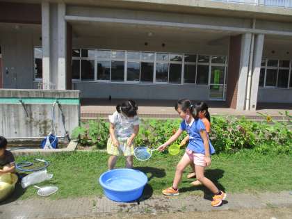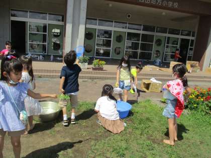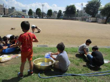 生活科「水で遊ぼう」の学習もも終わりを迎え、最後の時間は1・2組みんなでそれぞれの遊びを楽しみました。天気もよく、シャボン玉や的当てを楽しんだり、暑い日の水の気持ちよさを感じたりすることができました。