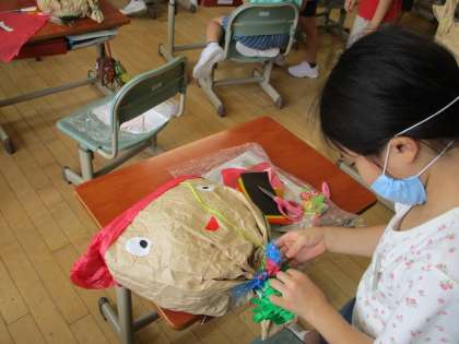 ぎゅっとしたくなる友達が完成してきています。「かわいくしたいから、色紙を切って飾りを作ろう」「目は気持ちがわかるから大事だね」など、思いを形にしようと活動しています。