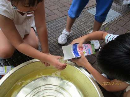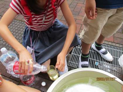 「家で探してきた容器には、どのくらいの水がはいるのかな。」実際にやってみると、水があふれて難しいなと感じた子供たち。「2人でやってみようよ」と、協力して調べる様子が見られました。