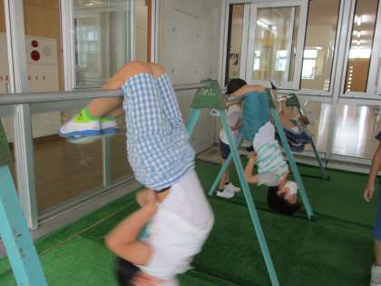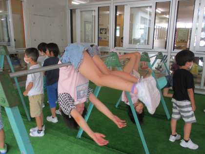 上手な友達の技を見たり、コツを伝え合ったりしながらできる技が増えてきています。「高い鉄棒でやってみよう」と、どんどんチャレンジしてやる気いっぱいです。