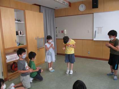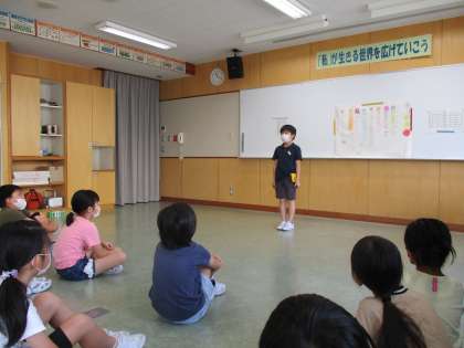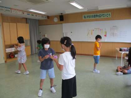 何種類かのゲームを組み合わせた「チャレンジランキング」大会をしました。はじめの言葉で「チームで協力してがんばろう」と宣言。チームごとに得点を競います。ペットボトルに割り箸やストローを入れるゲームでは、どのチームもクリアできなくて残念そうでした。運任せのジャンケン大会が1番盛り上がりました。「2学期も元気に会いましょう」と終わりの言葉で締めくくりました。