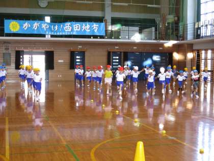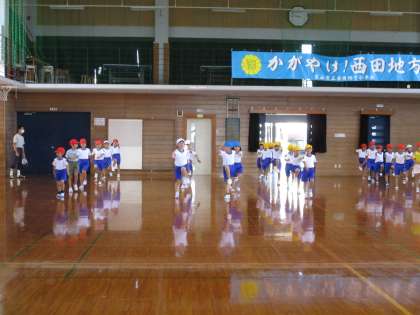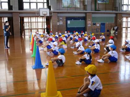 色団が決定しました。新しい色団グループで並ぶ練習をしたり、運動会に向けての行進練習を短い距離で行ったりしました。大型扇風機と頻繁な水分補給で暑さ対策をしながら行っています。足ぶみをそろえたり、止まる際に列をそろえたり、とても上手にがんばっています。