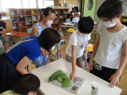 理科の学習でヘチマの観察・スケッチをしました。ヘチマの実を触った子供たちが「かたいけど、中は柔らかそう」と発言。中身の予想を伝え合う中で、中身を確かめたいという思いが膨らみ、一つの実を収穫して切ってみることにしました。多くの子供が予想した様子とは違ったこともあり、子供たちは「えぇ〜」と驚きの声をあげていました。実際に実物を見ることの大切さを感じた子供たちでした。