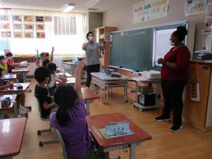 2学期初めての外国語の時間は、外国語の先生が二人でした。子供たちは元気よく挨拶をしたり、ノリノリでジェスチャーゲームをしたり、楽しみながら外国語に親しんでいました。