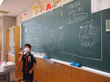理科で月の見え方の学習が始まりました。学級の話合いでは、今(午後2時半頃)に月が出ているか、出ていないかで大論争。出ていない派が優勢のまま話合いは終了し、実際にベランダに出て確かめることになりました。結果は……うっすらと白い月が青空の中に浮かんでいるのが見えました。多くの子供が、月が見えることに驚いた様子で、月の見える時間や位置に関心を高めていました。これから観察を重ねることで、月の見え方を明らかにしようとする子供たちでした。