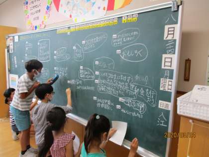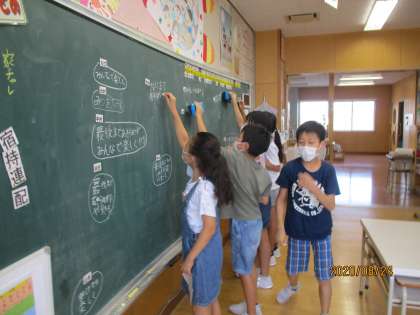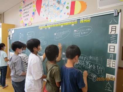 4年2組では、運動会のスローガンを決める話合いをしました。「こんな言葉を入れればいいんじゃないかなぁ。」「感染予防にも気を付けたいね。」子供たちからは、いろいろな声が聞こえてきました。全員が黒板にキーワードや文を書き出してみました。スローガンに向かって、思い出に残るすてきな運動会になるようにがんばります!