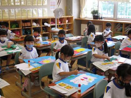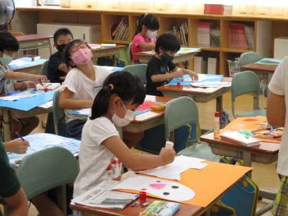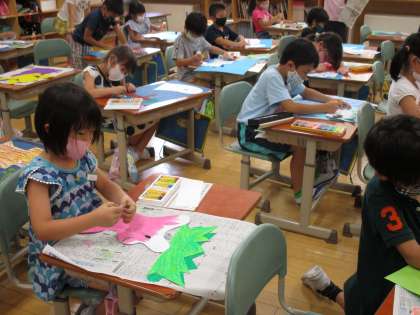 「切ったかたちから」の学習をしました。先週末の宿題で切った形から、向きを変えたり組み合わせたりしながら、何に見えるかを考えました。みんな想像豊かに、面白い作品に仕上がっていました。